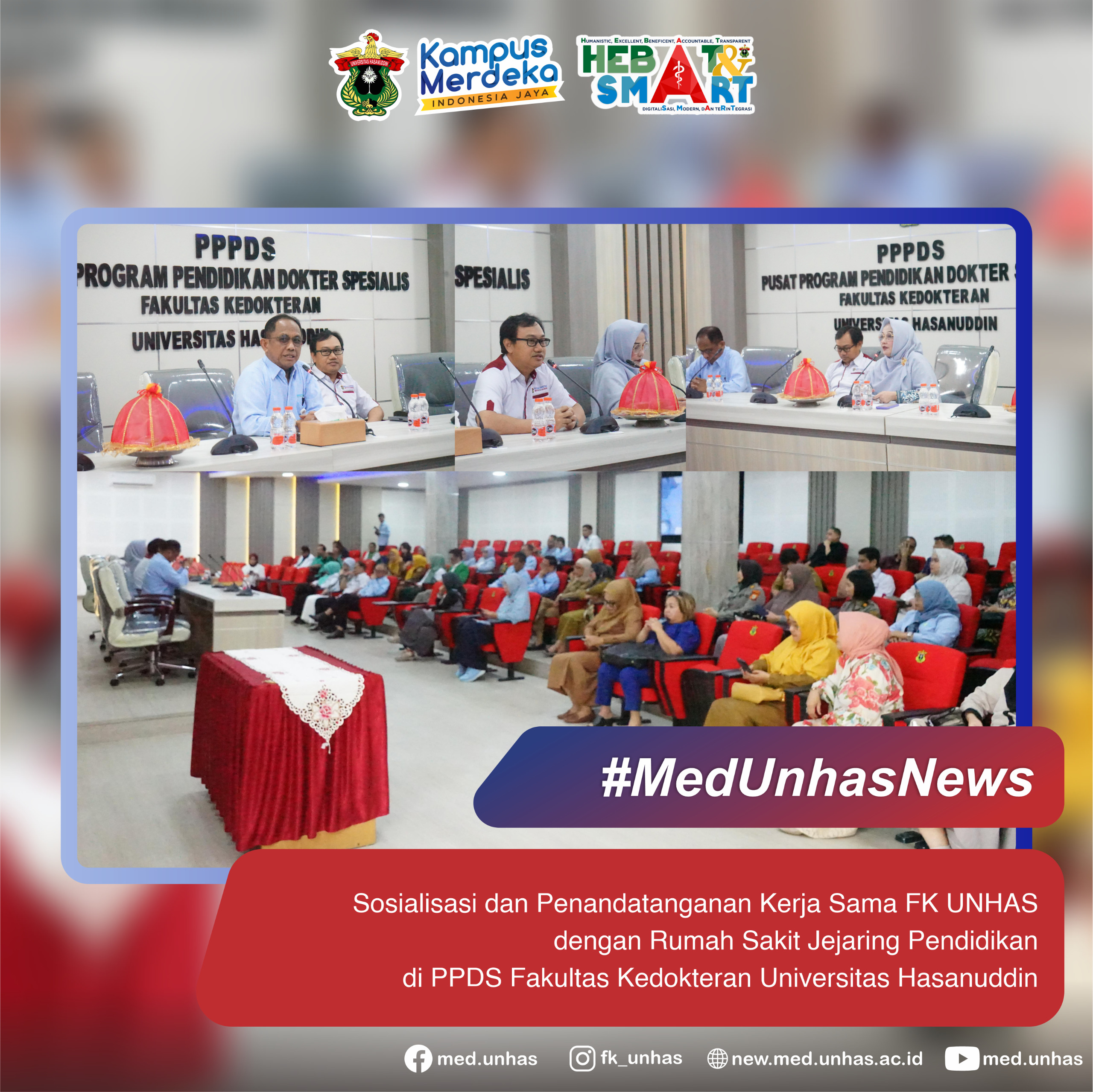 Fakultas Kedokteran Universitas Hasanuddin (FK Unhas) menyelenggarakan acara Sosialisasi dan Penandatanganan Kerja Sama dengan RSUP Wahidin Sudirohusodo Makassar dan sejumlah rumah sakit jejaring pendidikan. Acara ini berlangsung di Ruang Aula Program Pendidikan Dokter Spesialis (PPDS) FK Unhas dan dihadiri oleh berbagai pihak dari instansi terkait, baik secara luring maupun daring.