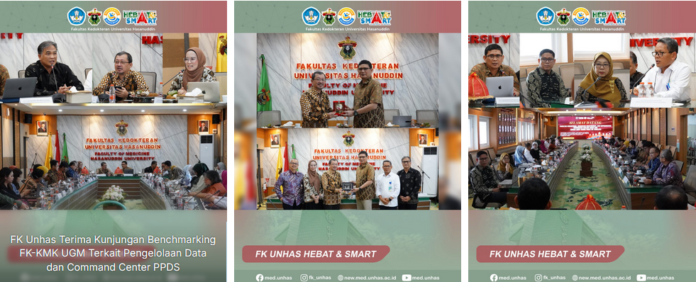 Makassar, 11 Desember 2025 – Fakultas Kedokteran Universitas Hasanuddin (FK Unhas) menerima kunjungan resmi delegasi Fakultas Kedokteran, Kesehatan Masyarakat, dan Keperawatan Universitas Gadjah Mada (FK-KMK UGM) dalam rangka kegiatan benchmarking terkait pengelolaan Data Management, Command Center, serta tata kelola Program Pendidikan Dokter Spesialis (PPDS) dan SUBPPDS. Kegiatan berlangsung di Ruang Rapat Senat FK Unhas dan dihadiri oleh Wakil Dekan Bidang Akademik dan Kemahasiswaan, Prof. dr. Agussalim Bukhari, M.Clin.Med., Ph. D., Sp.GK(K), Wakil Dekan Bidang Perencanaan dan Sumber Daya, Prof. dr. Firdaus Hamid, Ph.D., Sp.MK(K), MCE, Kepala Pusat Publikasi, Pengabdian Masyarakat dan Urusan Internasional, Prof. Dr. dr. Rina Masadah, M.Phil, DFM, Sp.PA(K) dan perwakilan RSUP Dr. Sardjito, serta jajaran delegasi FK-KMK UGM.