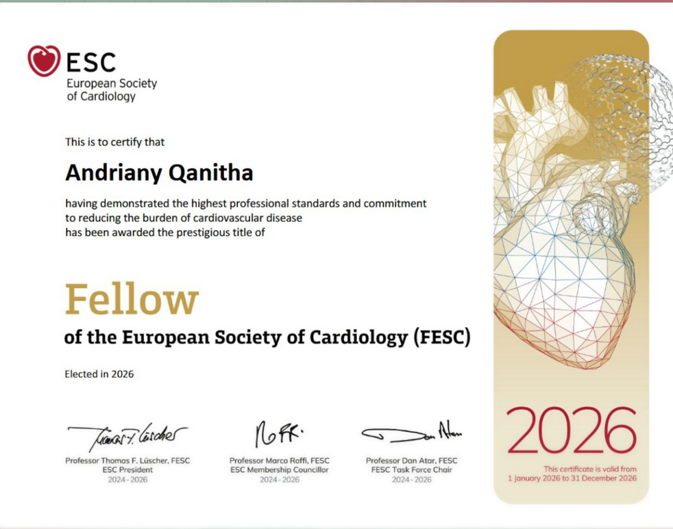 Gelar Fellow ESC (FESC) merupakan pengakuan prestisius di tingkat internasional yang diberikan kepada kardiolog dengan rekam jejak unggul dan konsisten dalam praktik klinis, riset ilmiah, pendidikan kedokteran, serta keterlibatan aktif dalam komunitas kardiologi internasional. Sebagai Fellow ESC, dr. Andriany Qanitha memperoleh berbagai hak akademik, antara lain akses penuh terhadap jurnal ilmiah ESC, kesempatan berpartisipasi dalam kongres dan forum ilmiah internasional, serta perluasan jejaring profesional global di bidang kardiovaskular.